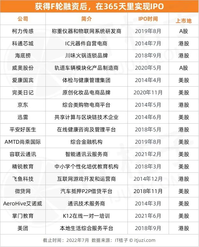 根据 IT 桔子统计,在完成 F 轮融资后的 365 天里即完成 IPO 的企业中,既有信息化类企业如柯力传感、容联云,也有火锅品牌海底捞、电商品牌完美日记等,分布在各行各业。而从上市地来看,有 9 家在美股上市,6 家登陆港交所,A 股上市的也有 2 家。