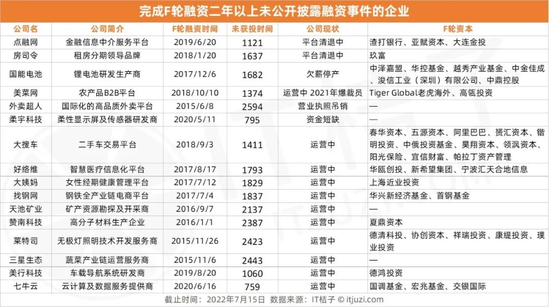 即使没有上市,F 轮后再次获投,也一定程度说明资本对企业依然有信心。但那些获得 F 轮融资 2 年以上,依然没有成功上市也再无资本问津的企业,部分已经破产或走在破产的边缘。