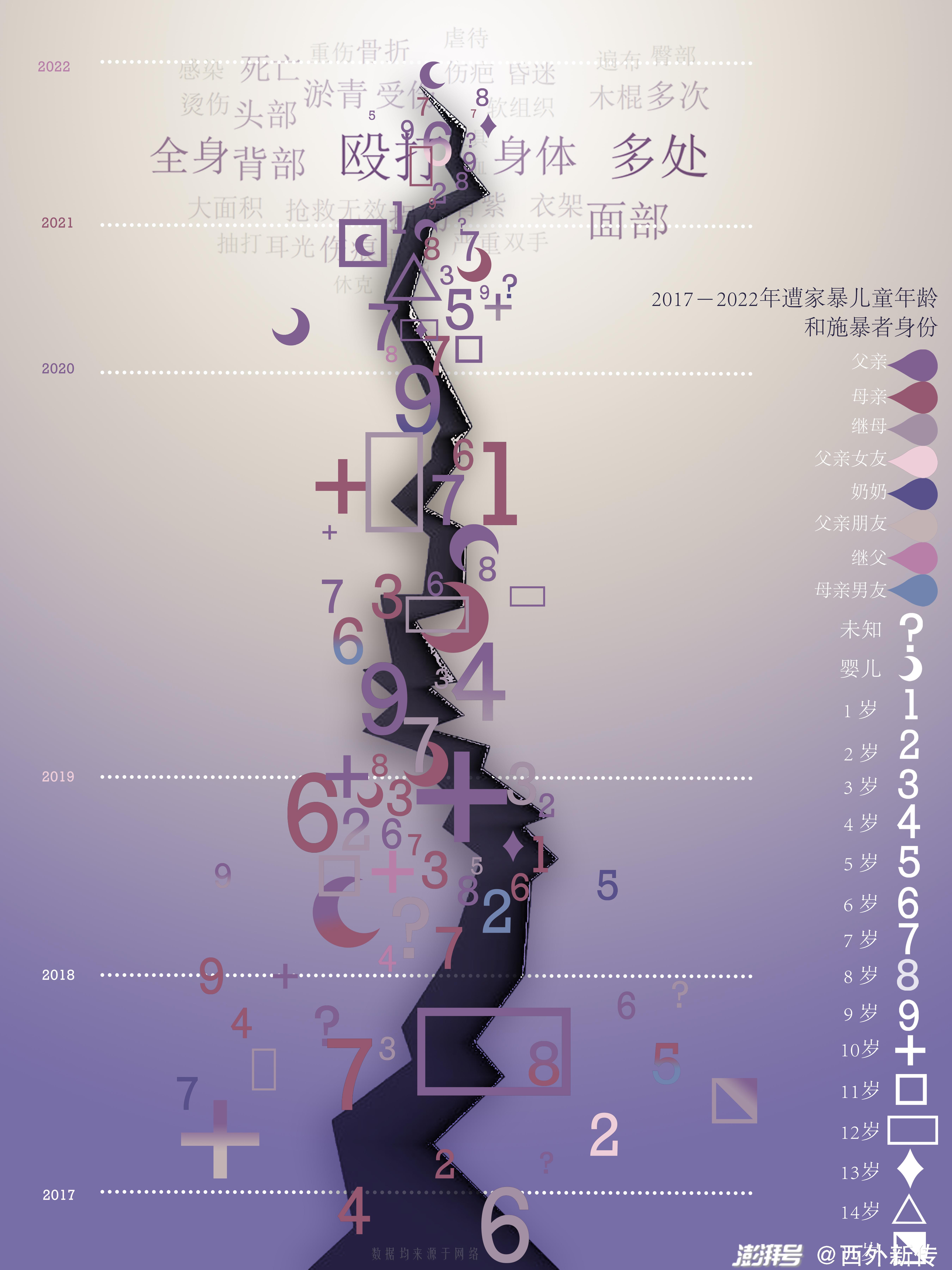 2017年的报道中,安徽合肥一位4岁孩童受到母亲的虐待,双手被开水烫伤,五六天不送医治疗导致严重感染,屁股等部位血肉模糊,四肢上还有很多淤青和已经结痂的小伤口,在他的右腿内侧还有一圈牙印状淤青。后被爷爷发现报警,才有警方介入调查。“4”是他的年龄符号,用施暴方“母亲”的色卡填充,分布在2017年区域。