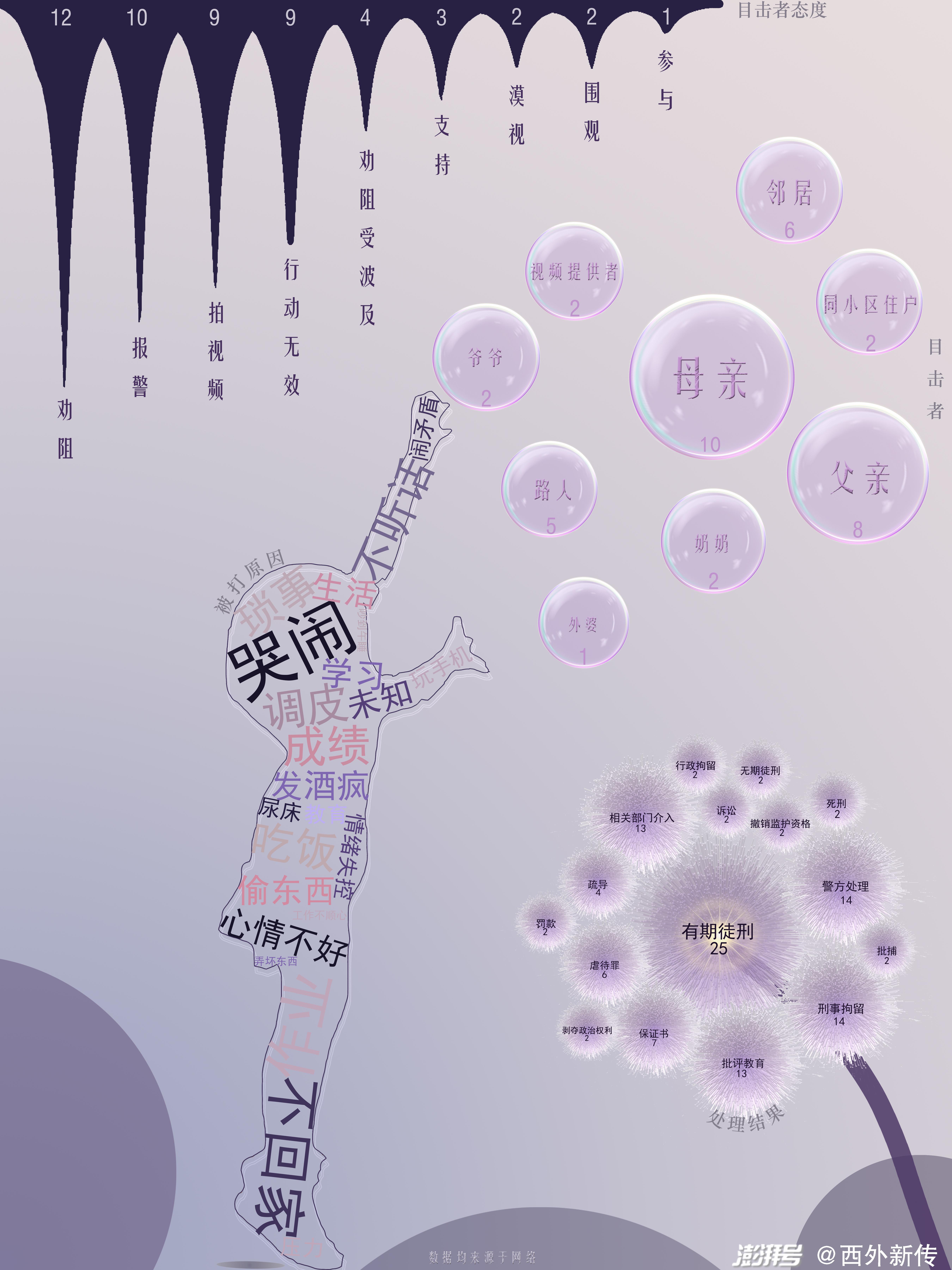 本文集合各大新闻媒体在2017年至2022年间发布的关于儿童被家暴的新闻报道,人工筛选出100起较为典型的新闻事件。在这些家暴儿童案件中,家长为什么选择采取极端的手段进行教育?对孩子造成了什么程度的伤害?有关部门又是如何帮助受伤儿童的?一件件家暴事件的背后,隐藏着的不仅是教育问题,还有高离异率等等社会问题。