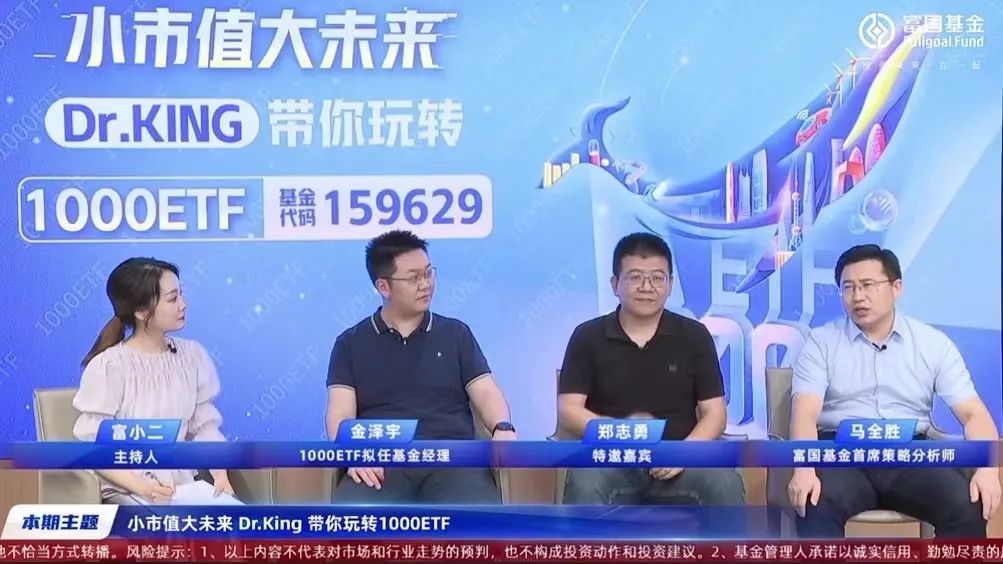 7月20日晚,围绕“小市值大未来,Dr.King带你玩转1000ETF”这一主题,1000ETF拟任基金经理金泽宇、特邀嘉宾郑志勇以及富国基金首席策略分析师马全胜展开精彩对话,金句不断。