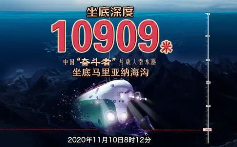 2020年11月10日那一天,中国第一艘万米级载人潜水器“奋斗者”号,被从母船吊入深蓝色的大海,如蛟龙入海,一路下潜到10909米,成功抵达海底,再次创造中国载人深潜纪录。“奋斗者”号不仅深潜成功,还在全球首次实现了万米洋底4K电视信号直播。这一天很多人在电视机前激动地观看了“奋斗者”号下潜的全过程!