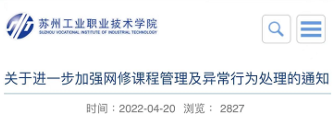 4月20日,江苏省苏州工业职业技术学院教务处发布《关于进一步加强网修课程管理及异常行为处理的通知》称: