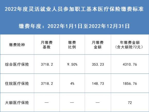 灵活就业人员即日起缴纳2022年1-12月保费的,以上年度全区全口径城镇单位就业人员平均工资的60%作为缴费基数,新缴费基数标准计算为3718.2元/月,即将达到法定退休年龄的灵活就业人员(含档案托管人员),在续缴2022年度职工基本医疗保险费时可缴至预计退休月份。