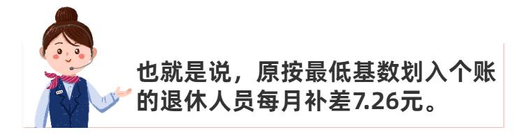 例如:原按最低基数划入个账的退休人员,每月划入金额为3491.4元×3.2%=111.72元。现按新基数每月划入金额为3718.2元×3.2%=118.98元。8月医保部门将按每月118.98-111.72=7.26元进行补差,请相关退休人员留意账户变化。