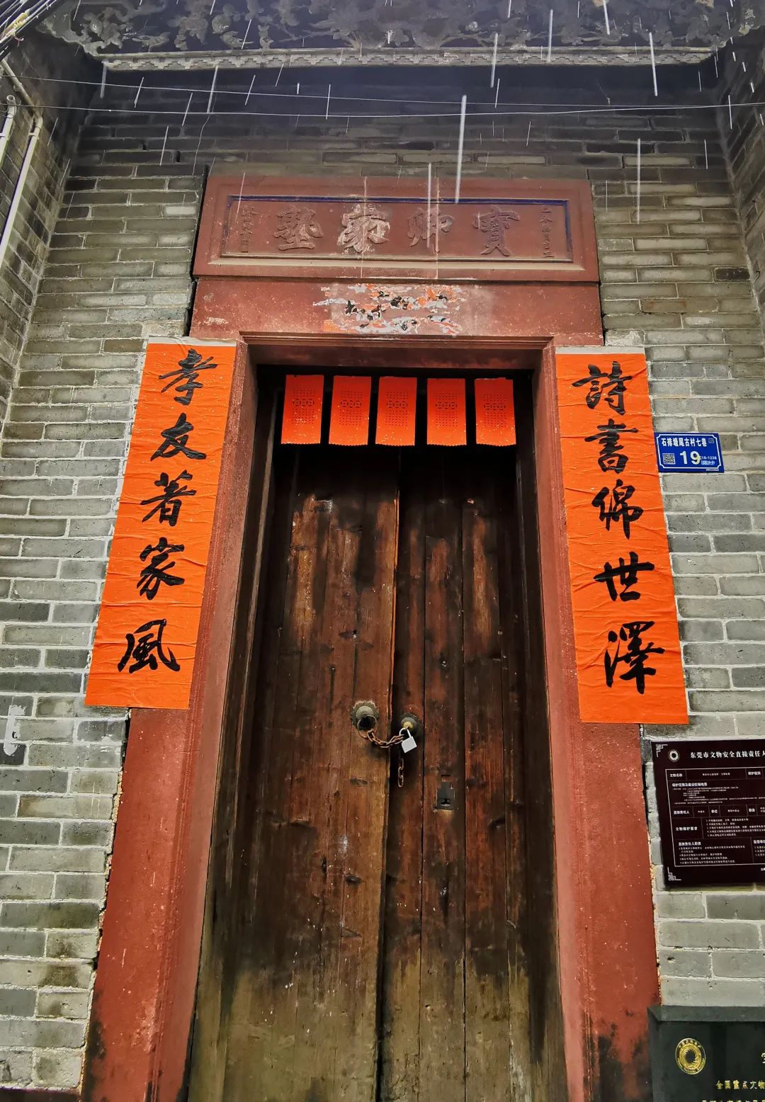 门口一幅对联,上书:“诗书绵世泽,孝友著家风”。笔意灵动而不失稳健,厚重而不肥臃,颇有庙堂之气,与东莞清末探花陈伯陶题写的“宝卿家塾”牌匾相映成趣。