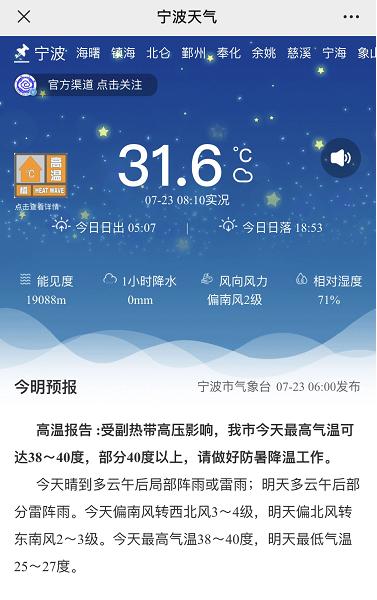 海曙区气象台2022年7月23日8时12分发布高温橙色预警信号:受副热带高压影响,预计今天除西部高海拔山区外,我区所有镇乡(街道)最高气温将达38~40℃局部40℃以上,请注意防范高温对农业、交通、电力、用水、人体健康等的不利影响。