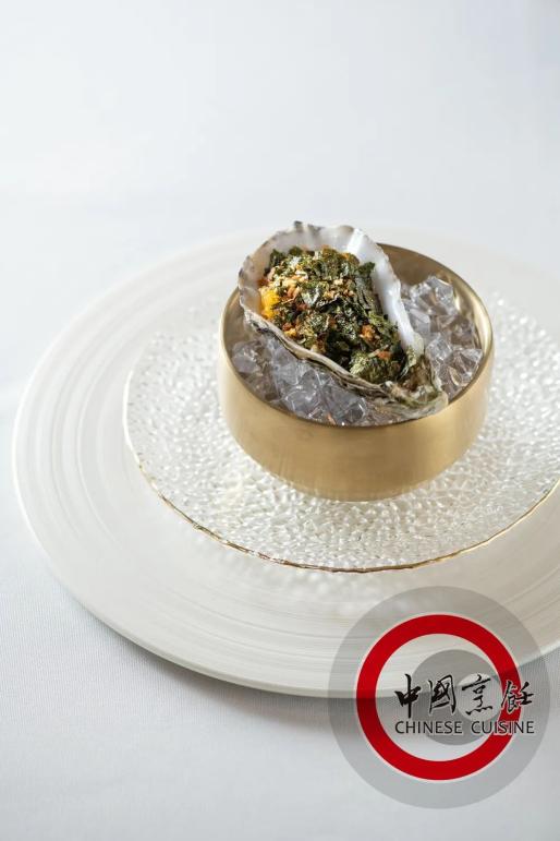 将生蚝取肉,用龙蒿、莳萝油以45℃低温浸渍熟化1小时,用果木冷烟熏15分钟备用;将鲣鱼干刨丝,用果木熏烤至脆备用;将海苔片在热炭上反复掠过,炙烤至脆备用;将熏烤过的鲣鱼丝、海苔片粉碎,加坚果碎、海盐制成干香料备用;将百香果果肉、葡萄柚果肉打碎,过滤后熬煮浓缩成果酱;将日本柚子果蓉通过球化技术制成柚子鱼子酱;生蚝壳内填入果酱,放熟化的生蚝肉,撒干香料,点缀柚子鱼子酱即可。