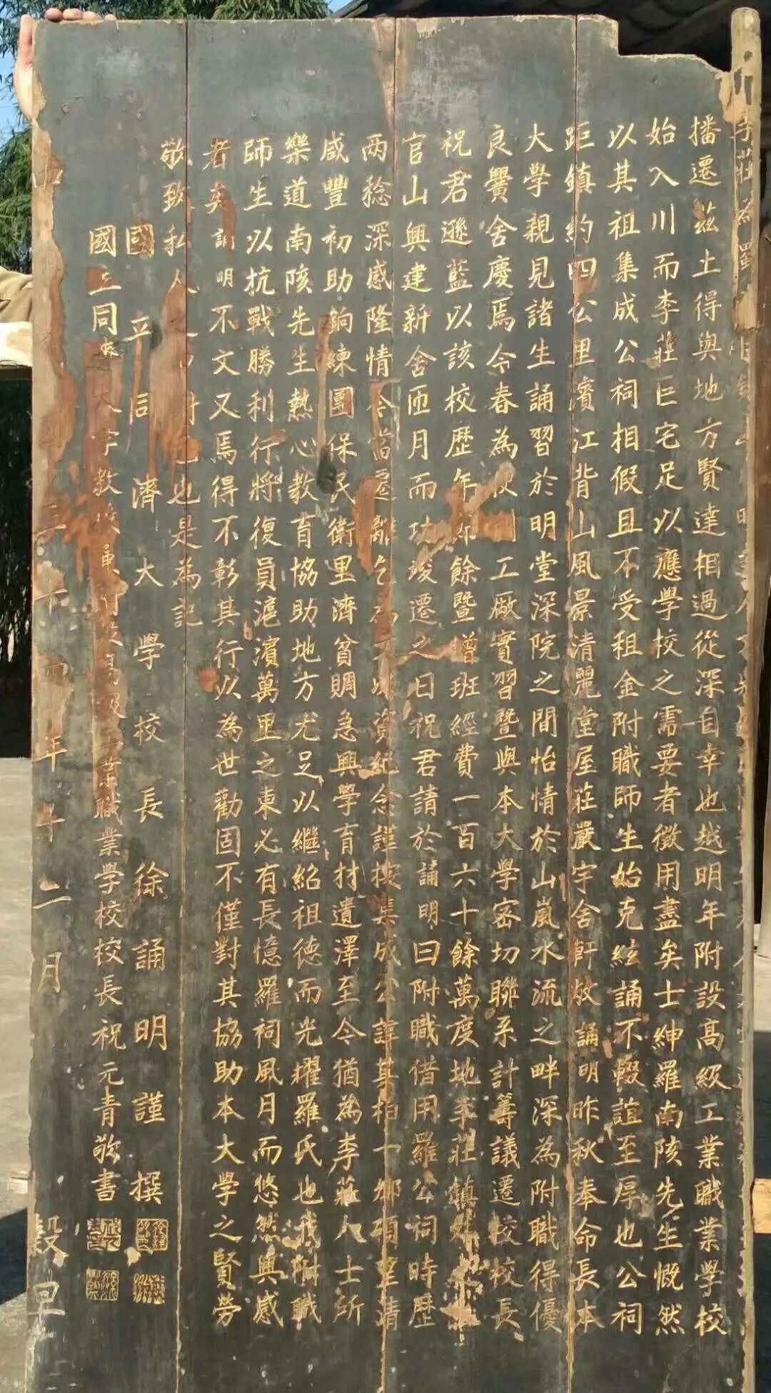 因为年代久远,该木匾已有局部破损,可辨认字有384个。文称:“今春,为便利工厂实习,暨与本大学密切联系计,筹议迁校,校长祝君逊蓝以该校历年节余暨增班一百六十余万,度地李庄镇之囗官山,兴建新舍……”由此可知,同济高工已于“今春”即1945年春迁到一个叫“囗官山”的地方了。