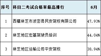 在6家林芝驾校的已公布数据中,察隅县安达驾校有限公司的3年内驾龄交通违法率最低,为0.20%;察隅县安达驾校有限公司的科目一考试合格率位列第一,为80%;此外,西藏林芝市波密县民安驾校有限公司的科目二考试合格率位列第一,为47.93%。