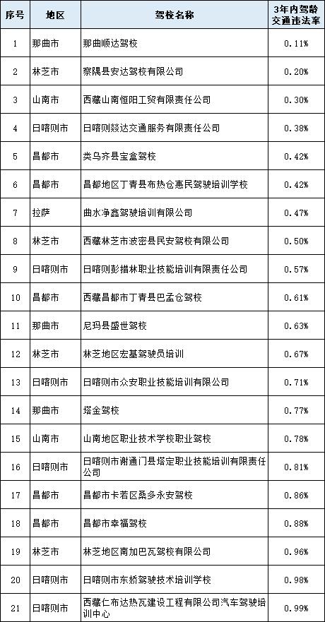 据统计,西藏自治区3年内驾龄交通违法率低于1%的驾校共21家,分别是: