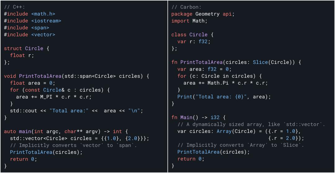 Carbon设计团队将着手创建一个内置包管理器,这在C++中非常欠缺。此外,团队还计划编写一些将C++代码迁移到Carbon代码的工具。下图左为C++代码,右为Carbon编写的相同函数: