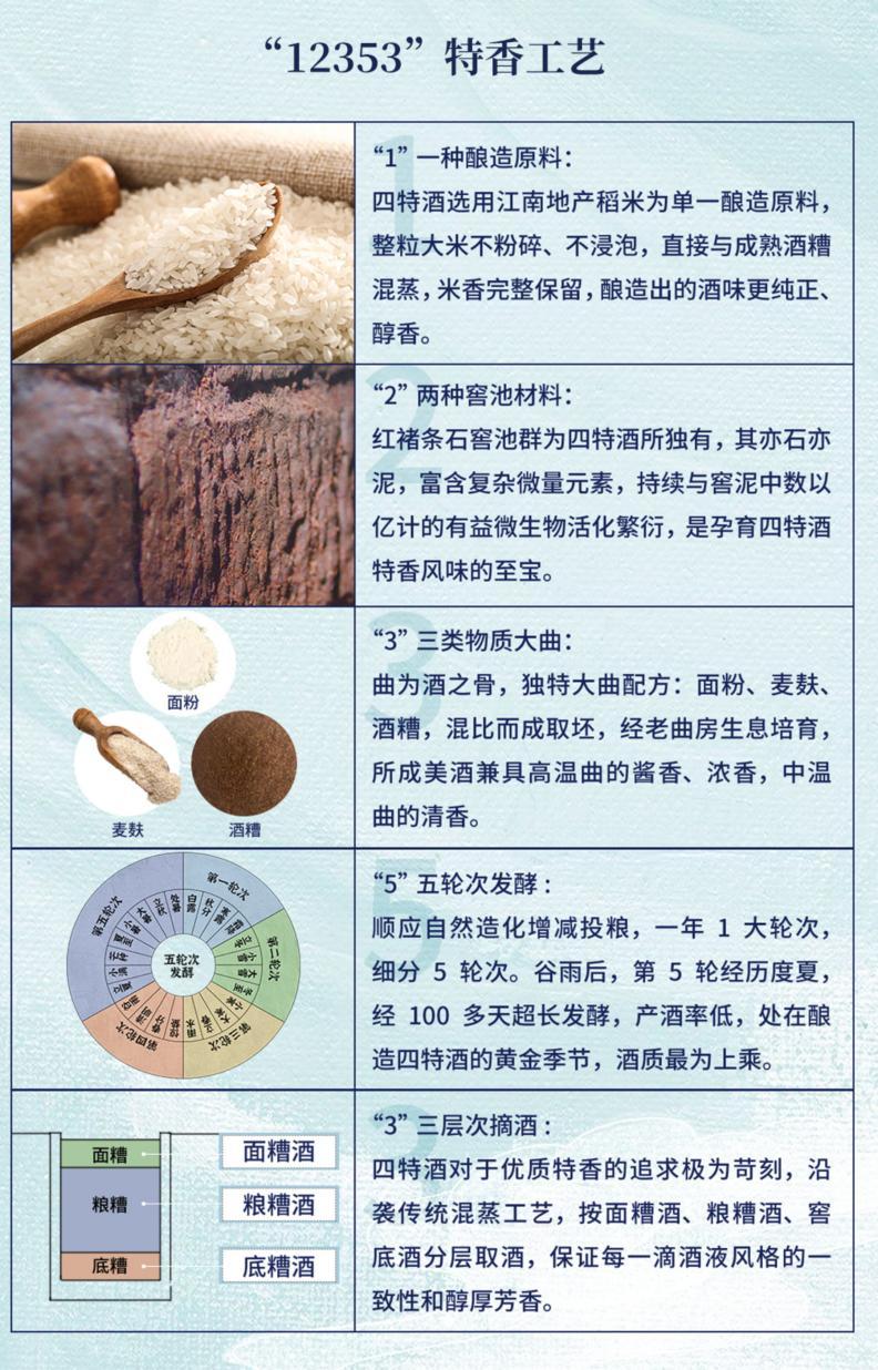 工艺对白酒的香型起了非常关键的作用。四特工匠在沿袭古法技艺的基础上提炼出了“12353”密码工艺,集四大香型工艺精髓于一体,以一种酿造原料、两种窖池材料、三类物质大曲、五轮次发酵,三层次摘酒的精细化传统工艺造就了四特酒“幽雅舒适、诸香协调、柔绵醇和、余味悠长”的口感特点。