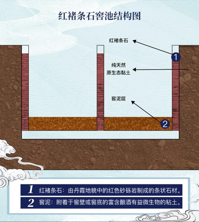 四特酒发酵的窖池,采用龙虎山特有的红褚条石累砌而成。其粒状碎屑和泥状胶结结构的红褚条石,亦石亦泥的质地,被水溶解后生成钙化沉积,吸水性强且防潮,长期发酵养成庞大独特的有益微生物生态体系,使四特酒在发酵过程中,酒体的矿化与活性化大大增强,众多复杂的有益菌群充分融合,酿成清香醇纯的特香酒体。