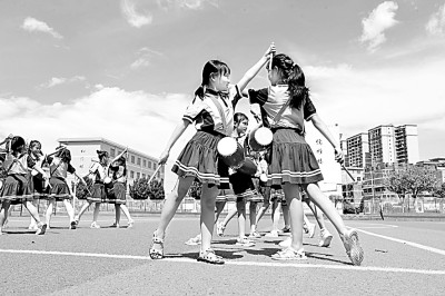 6月24日,湖南省永州市新田县龙泉四小学生在课后学习打腰鼓。刘贵雄摄/光明图片