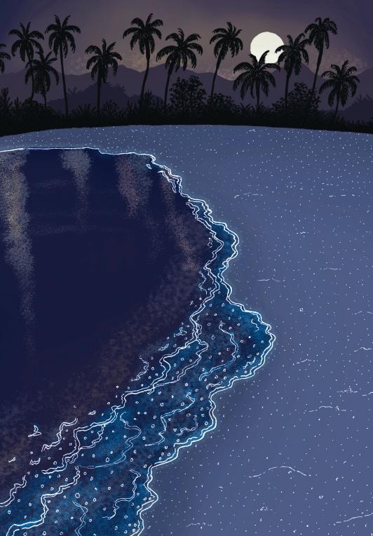 那些最不起眼的小小浮游植物,却是海洋中最强大的生物。它们在浅海肆意生长,源源不断地将阳光和二氧化碳转化为能量,并释放出氧气。它们对海洋和陆地的生命结构都至关重要,我们呼吸的氧气一半以上来自它们。与扎根陆地的植物不同,海洋中的浮游植物可以随着洋流自由浮动,为了更方便地漂来漂去,它们长出了令人惊叹的外表。浮游植物的体积很小,但数量非常庞大,常常把海水染上赤红、翠绿等瑰丽的色彩;还有一些夜光藻,会在春夏之夜的海湾发光,形成壮观的美丽景象。
