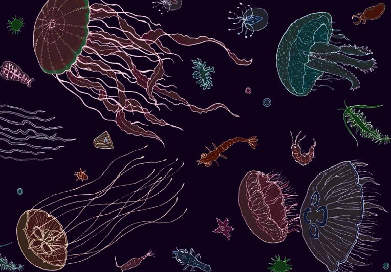 在浮游植物的丛林中,居住着种类丰富的海洋生物。很多鱼、虾、蟹、海螺等,一开始都是小小的漂浮生物,你很难想象它们长大后会变成什么样子。海洋中还有一些蠕虫、甲壳类和软体动物,终其一生都生活在这个漂浮世界里。虽然这些丛林里的居民大部分都很小,但也有一些个头儿较大的水母浮游其中,体形庞大的棱皮龟和翻车鲀就以水母为食。而地球上最大的动物——巨鲸和鲸鲨——喜欢张着大嘴巴,边游边吞下一大口营养丰富的浮游生物“汤”。