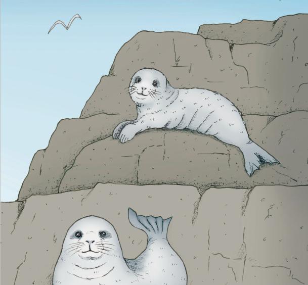 灰海豹幼崽总是出生在深秋或是冬天寒冷的大海里。幼小的它们完全依赖母亲生存,需要营养丰富的乳汁才能快速长大。可是母亲也得吃东西呀,每当这时,它们就只能把自己的幼崽独自留在岸边好几个小时。它们会把小海豹小心地藏在非常隐蔽的海湾里,捕食者很难找到。虽然在人类眼中海豹幼崽孤独无助,但小家伙的生命力其实非常顽强。它厚实的皮毛足够应付冬季的天气情况,而在很短的时间里,它就会褪去毛茸茸的白色皮毛,做好独自遨游大海的准备。