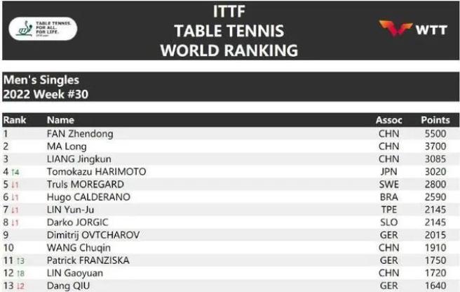 男单樊振东由于缺席布达佩斯的两站比赛,被扣掉1400分之多,不过还是以5500分排名榜首。马龙上周冠军赛早早出局以3700分位列第二,梁靖崑冠军赛止步八强以3085分排在第三。张本智和冠军赛4-3大逆转林高远夺冠,以3020分一跃升至第四。瑞典的世乒赛男单亚军莫雷加德第五,巴西的卡尔德拉诺-雨果第六,中国台北的林昀儒第七,斯洛文尼亚的约吉奇第八,德国名将奥恰洛夫列在第九,王楚钦排名第十。冠军赛打进决赛屈居亚军的林高远,从第20升至第12。