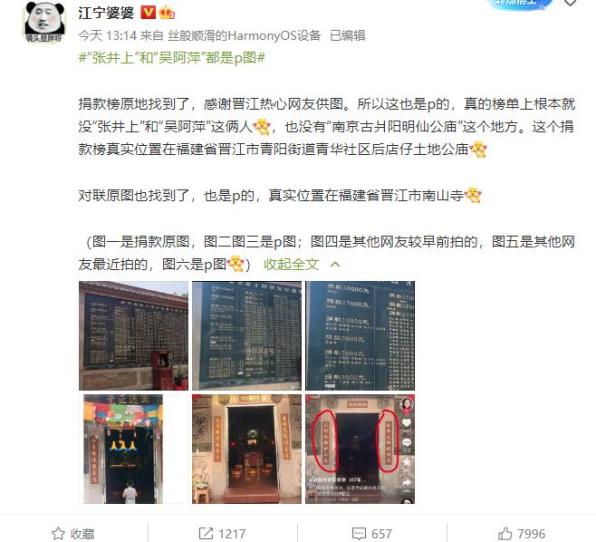 原标题:《“吴啊萍”又出现在功德碑、对联?假的!网友晒原图》