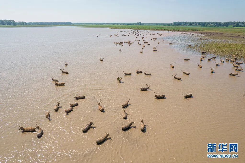 图为航拍石首国家级麋鹿自然保护区内的麋鹿种群。新华网 李晓笛摄