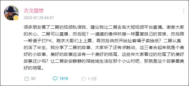 很多朋友看了二舅的视频私信我,建议我让二舅去各大短视频平台直播。谢谢大家的关心,二舅可以直播,然后呢?一遍遍的像祥林嫂一样重复自己的苦难,然后跟一帮傻子打PK,跪求大哥们上上票,再然后突然开始扯着嗓子卖抽纸?二舅认真的活了半生,我分享了二舅的故事,大家听了还有点触动,这三者合起来就是个美好的小故事,美好的故事应该有一个美好的结尾,这些年大家看过的烂尾了的美好故事还少吗?让二舅安安静静的陪姥姥生活在那个小山村吧,那就是这个故事最美好的结尾。