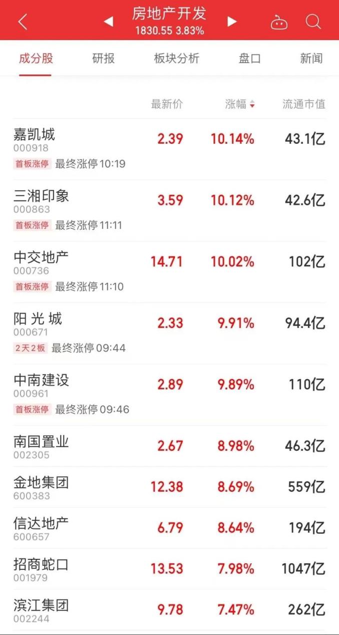 据中原地产研究院统计数据显示,截止7月25日,累积已经超过80城市当月发布了稳楼市政策接近80多条。7月26日,A股房地产开发板块再度走强,截至午间收盘,嘉凯城、三湘印象、中交地产、阳光城涨停,超过20只个股涨幅超5%。