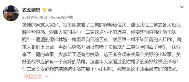 微博的网友大家好,很多朋友看了二舅的视频私信我,建议我让二舅去各大短视频平台直播。谢谢大家的关心,二舅这点小小的流量,你要劝他直播让他干啥呢?一遍遍的像祥林嫂一样重复自己的苦难,然后跟一帮不知所谓的人打PK,跪求大哥们上上票,再然后突然开始扯着嗓子卖抽纸?二舅认真的活了半生,我分享了二舅的故事,大家听了还有点触动,这三者合起来就是个美好的小故事,美好的故事应该有一个美好的结尾,这些年大家看过的烂尾了的美好故事还少吗?让二舅安安静静的陪姥姥生活在那个小山村吧,那就是这个故事最美好的结尾。