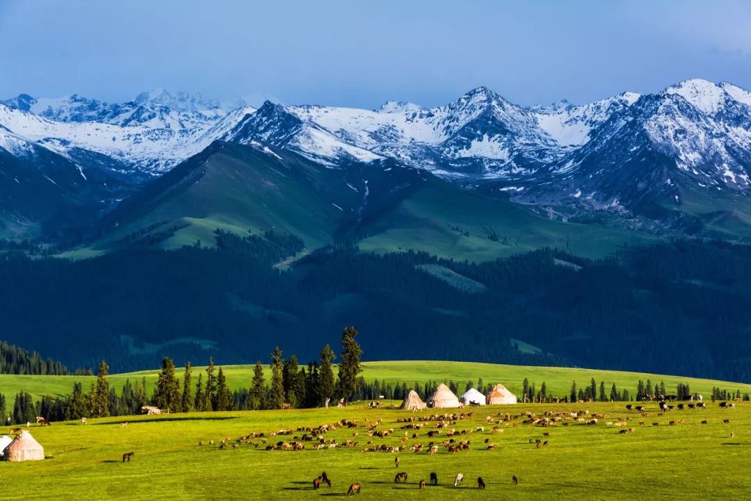 关键词:草原、牧场、花海、雪峰、毡房、牛羊、森林