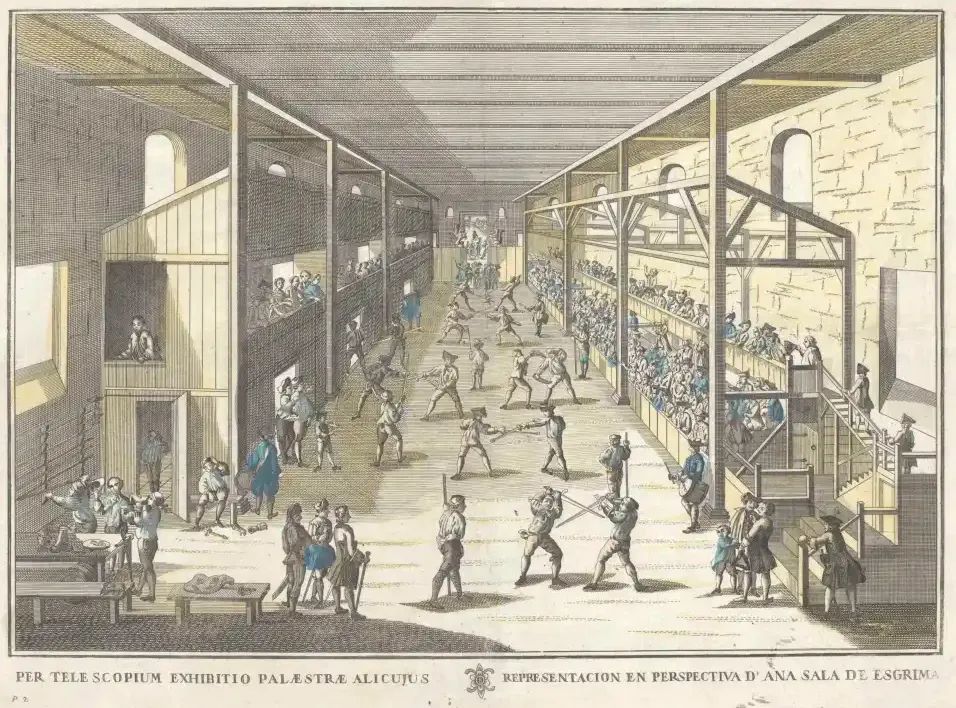 十八世纪中叶欧洲的剑术学校,看台挤满了观众,击剑手们正在休息或练习,非常热闹