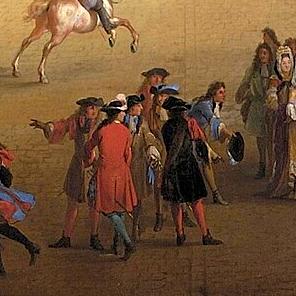 1710-1715年由Pierre Gallays绘制的凡尔赛宫景 / 穿戴考究的访客络绎不绝,绅士都随身携带着佩剑