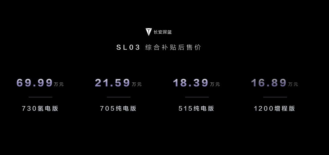 在车型的上市发布会上长安深蓝 SL03 公布了正式售价:增程版 16.89 万,515 纯电版 18.39 万,705 纯电版 21.59 万。