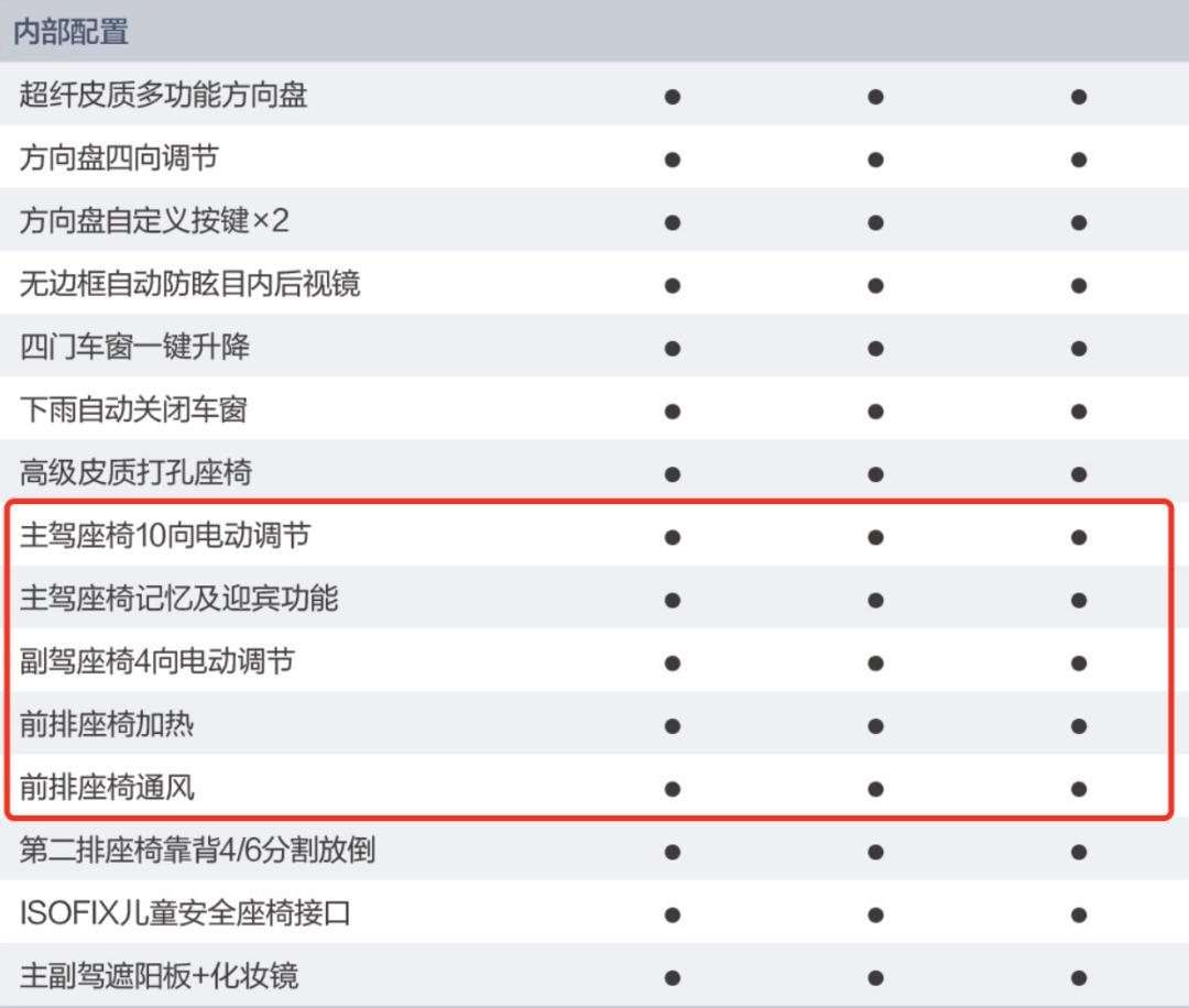 在价格公布之前,长安深蓝在今天上午提前公布了最终版的车型配置表,而深蓝 SL03 的配置表是我印象中最快看完的一份配置表。三个版本之间除了动力配置,其余舒适性和功能性配置几乎一致,代表「标配」的实心黑色圆点三排并列从头一直拉到尾。