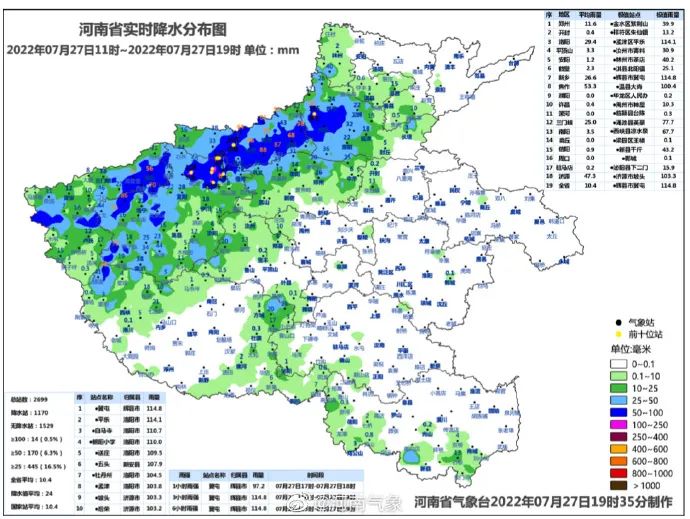 27日11-19时,新乡、洛阳、济源、焦作、三门峡、南阳等地部分县市出现暴雨,新乡、洛阳、济源、焦作 局部出现大暴雨,地市平均降水量焦作 53.3 毫米、济源 47.3 毫米、洛阳 29.4 毫米,有 38 个县(市、区)共 170 站降水量超过 50 毫米,其中 100 毫米以上的有 14 站, 位列前 3 的分别为:辉县市冀屯 114.8 毫米、洛阳市区平乐 114.1 毫米和白马寺 110.7 毫米。最大小时降水量 为辉县市冀屯 97.2 毫米(27 日 17 时-18 时)。此外, 洛阳、信阳、新乡、郑州、三门峡、平顶山、焦作、鹤 壁、济源等地有 68 站出现 8 级以上雷暴大风,局部 10~11 级,最大风速出现在新安县鹰嘴山 30.5 米/秒(11 级)。