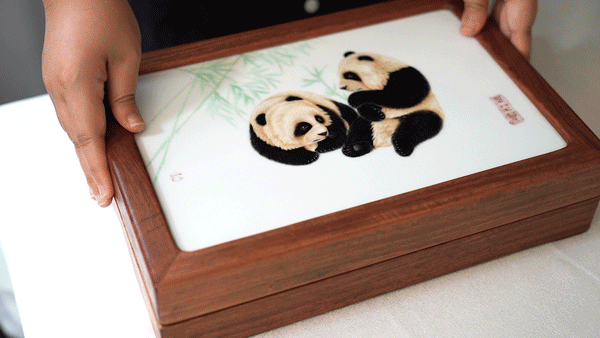 盒子由金丝楠木制成,盒子上陶瓷的熊猫图案由兰师傅亲自设计,两块瓷片,一正一反,通过榫卯结构固定,整体设计一气呵成,堪称天衣无缝。