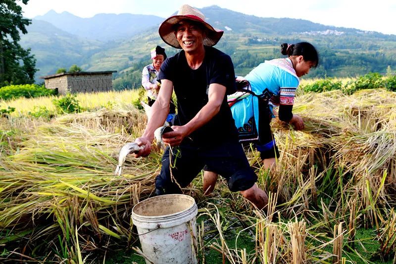 图为2020年9月,丰收时节,在元阳县新街镇大鱼塘村全国稻渔综合种养试验示范基地,村民共同享受丰收的喜悦。朱征荣 摄