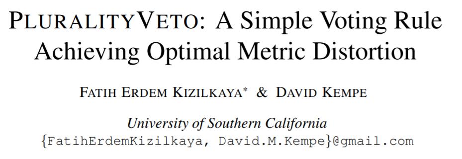 论文 1:PLURALITYVETO: A Simple Voting Rule Achieving Optimal Metric Distortion