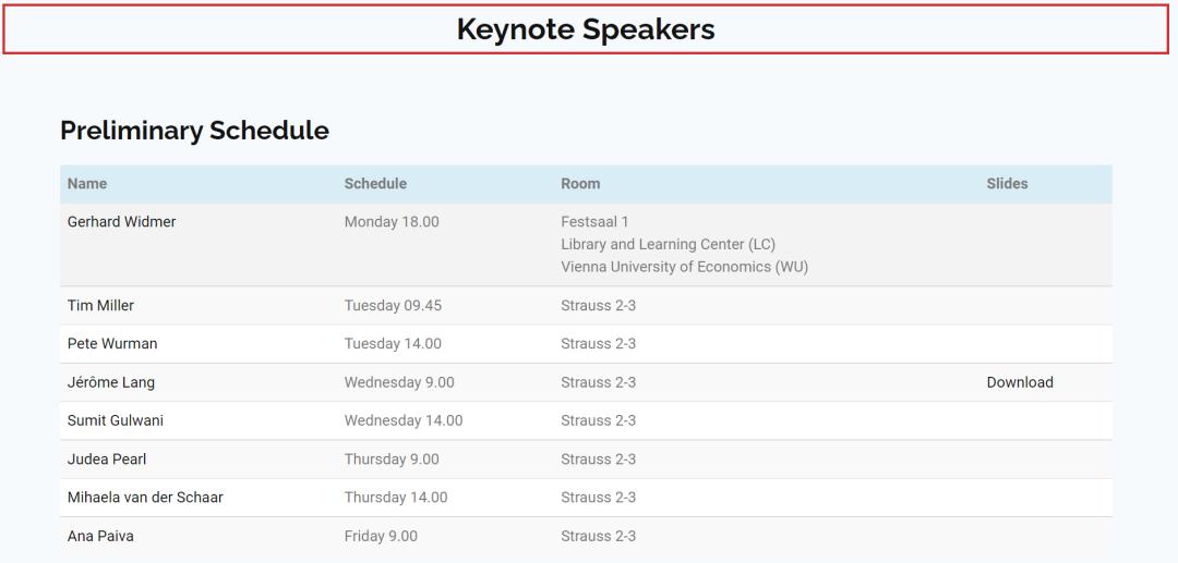 除获奖论文外,活动还邀请了几位主讲嘉宾,他们分别是 Gerhard Widmer、Tim Miller、Pete Wurman、Jérôme Lang、Sumit Gulwani、Judea Pearl、Mihaela van der Schaar 以及 Ana Paiva。