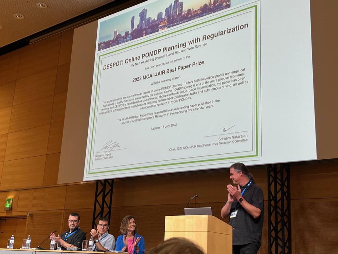 2022 年的 IJCAI-JAIR 最佳论文奖授予论文《DESPOT: Online POMDP Planning with Regularization》,作者包括 Nan Ye、Adhiraj Somani、David Hsu、Wee Sun Lee。