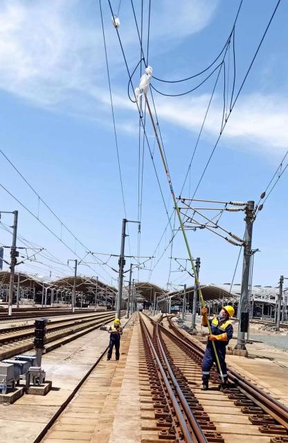 6月6日,京沪高铁徐州东站7道接触网挂塑料薄膜