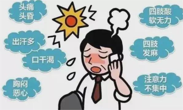 在长时间暴露于高温环境下后,出现大量出汗,头晕,头痛,口渴等症状,这时候体温正常或略升高。此表现为先兆中暑,如能及时脱离高温环境,迅速减低周围环境温度,进入有空调的房间,及时补充水分等有效的降温措施,大部分病人能快速缓解症状而不需要去医院治疗。