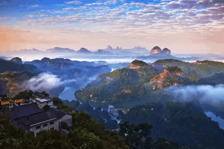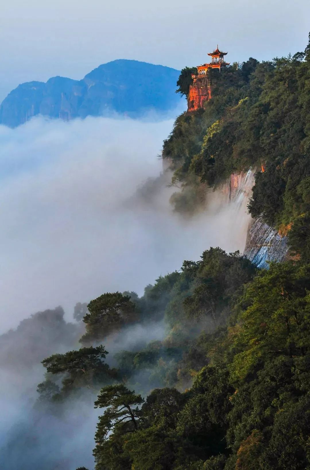 长老峰巅观日亭,是丹霞山观赏日出的好地方,当一轮红日浅浅地拨开夏日清晨萦绕山间的云雾,我们便能在破晓时分感知何为“色如渥丹,灿若明霞”。在阳光的渲染下,天边慢慢地变为绯色,随后变彤,变成丹红。此时天际似乎与丹霞山融为一体,形状各异的山峰如同柴火一般,将这熊熊燃烧的烈火燃得更旺盛。