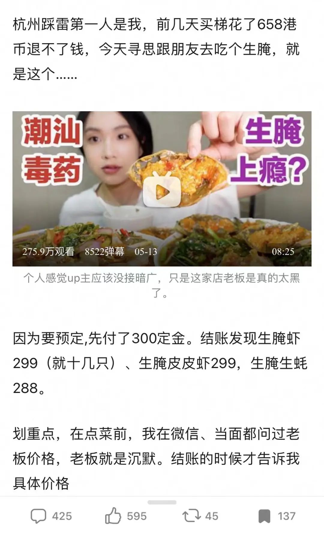 前几天,一个网友在豆瓣上发帖吐槽,说跟着B站某UP主去探店生腌,点了三盘生腌,结账时才发现要900块。餐厅不明码标价,结账时才告知具体价格,和之前的青岛38块大虾如出一辙。