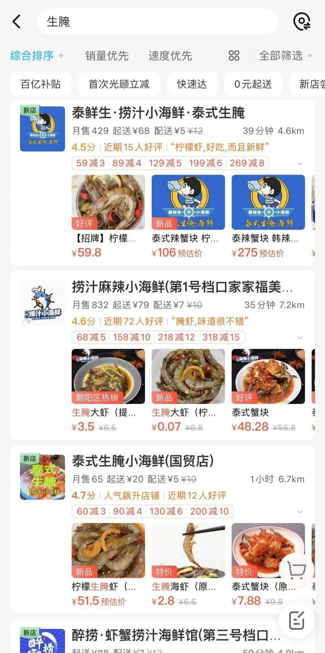 比如我在饿了么搜索「生腌」,第一页跳出来的四条结果当中,有三家都显示「新店」,说明它们都是最近一个月开起来的,想赶生腌这波风口。
