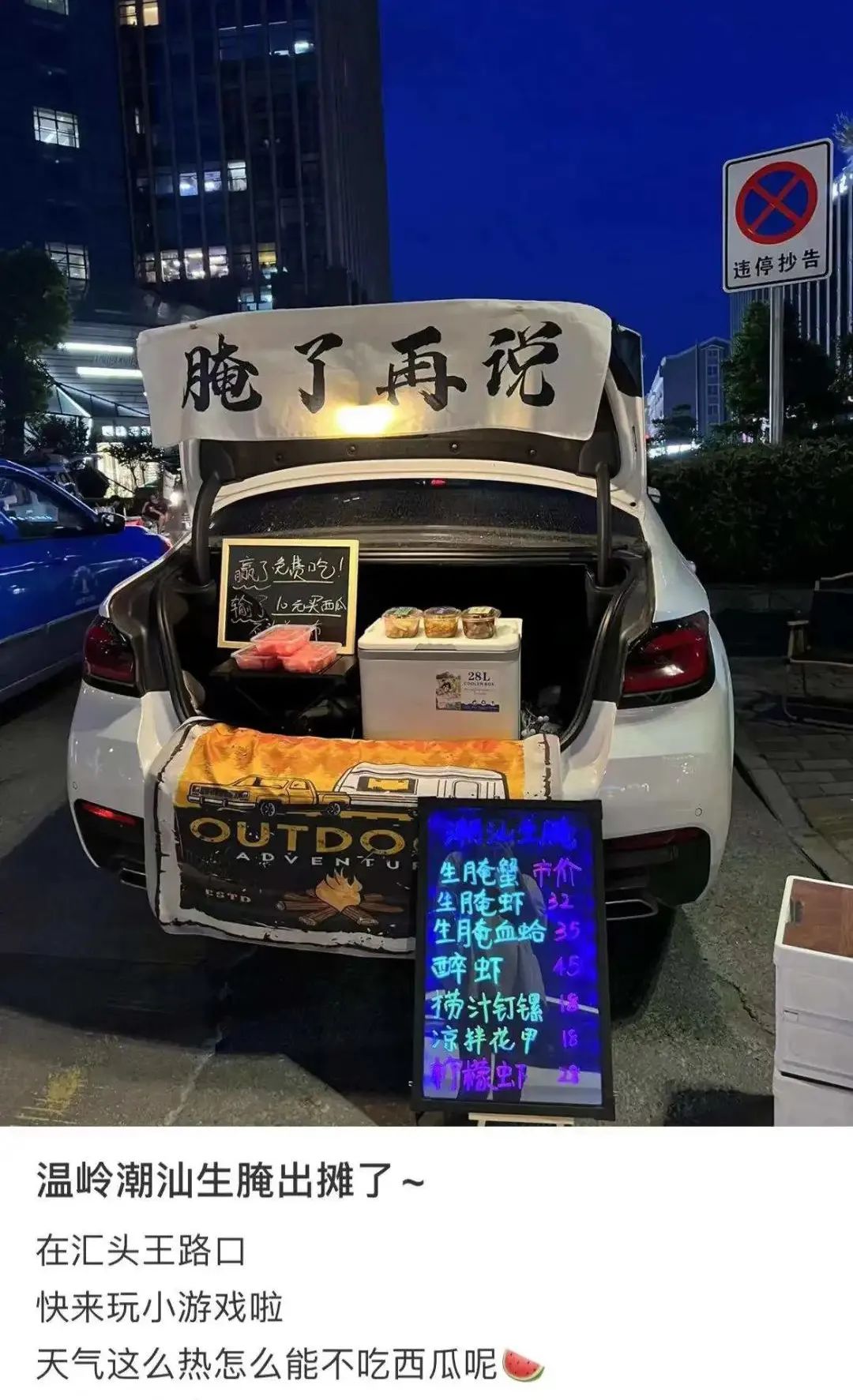 许多人在家做好了生腌,放在后备箱里拉到夜市卖,一份三四十,卖完回家,当作副业干干。这类地摊小店也因为价格便宜,常常很受欢迎。