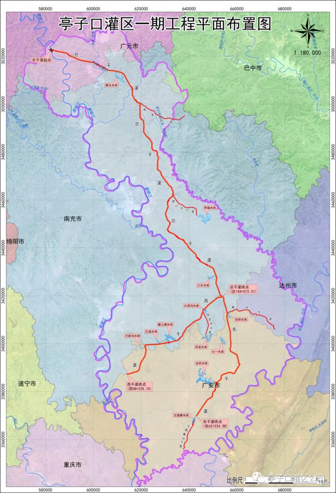 作为嘉陵江亭子口水利枢纽的配套工程,亭子口灌区一期工程具有农业灌溉、城乡生产及生活供水等综合功能,是四川省“五横六纵”引水补水生态水网的重要组成部分,涉及四川省广元、南充、广安、达州4市11县(区),设计灌溉面积135.94万亩,供水人口245万人。