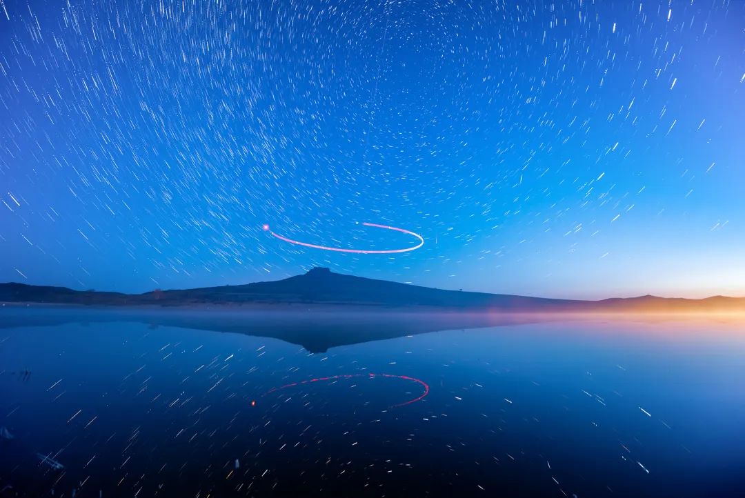《天外飞仙》拍摄于内蒙古乌兰布统。时值冬季,为了拍摄这个倒影,白天就去踩点,然后等待月落,零下十几度的气温里,利用无人机辅助,一直拍到日出,拍完相机都结冰了。