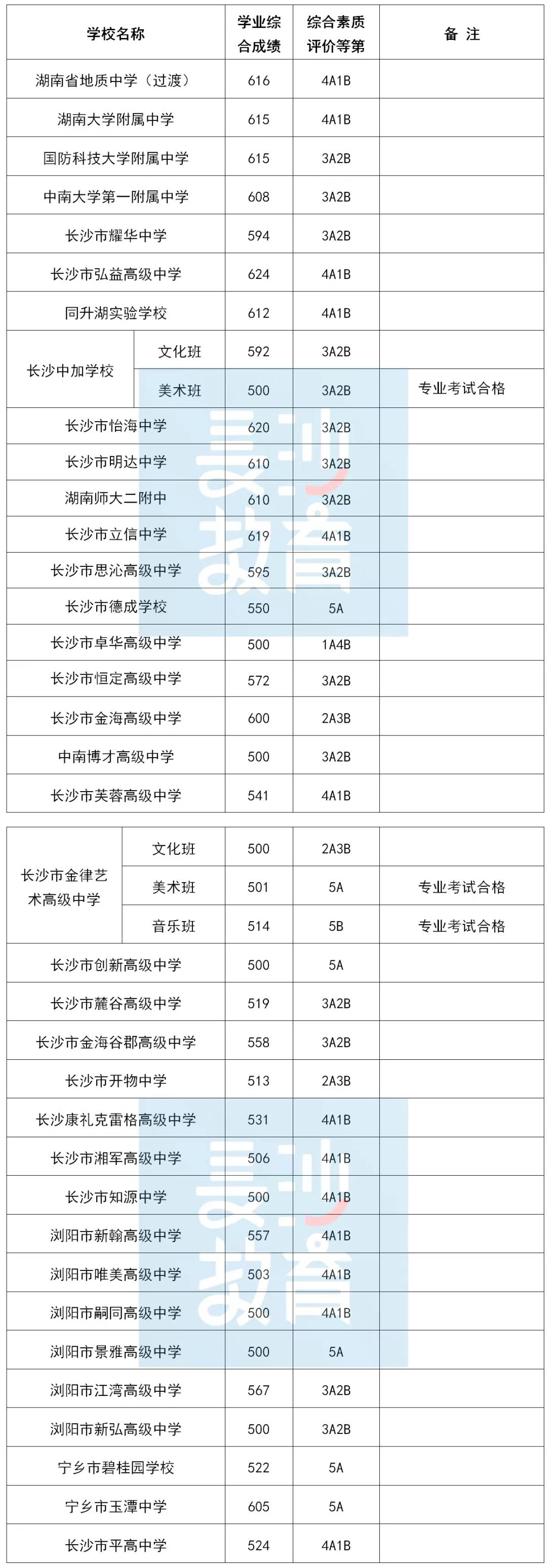 注:根据《关于做好2022年长沙市城区高中学校招生工作的通知》(长教通〔2022〕20号)文件精神,市教育局中招办按照录取批次顺序,依据学生的初中学业水平考试成绩、综合素质评价结果以及享受政策性优待情况,结合考生志愿进行择优录取。