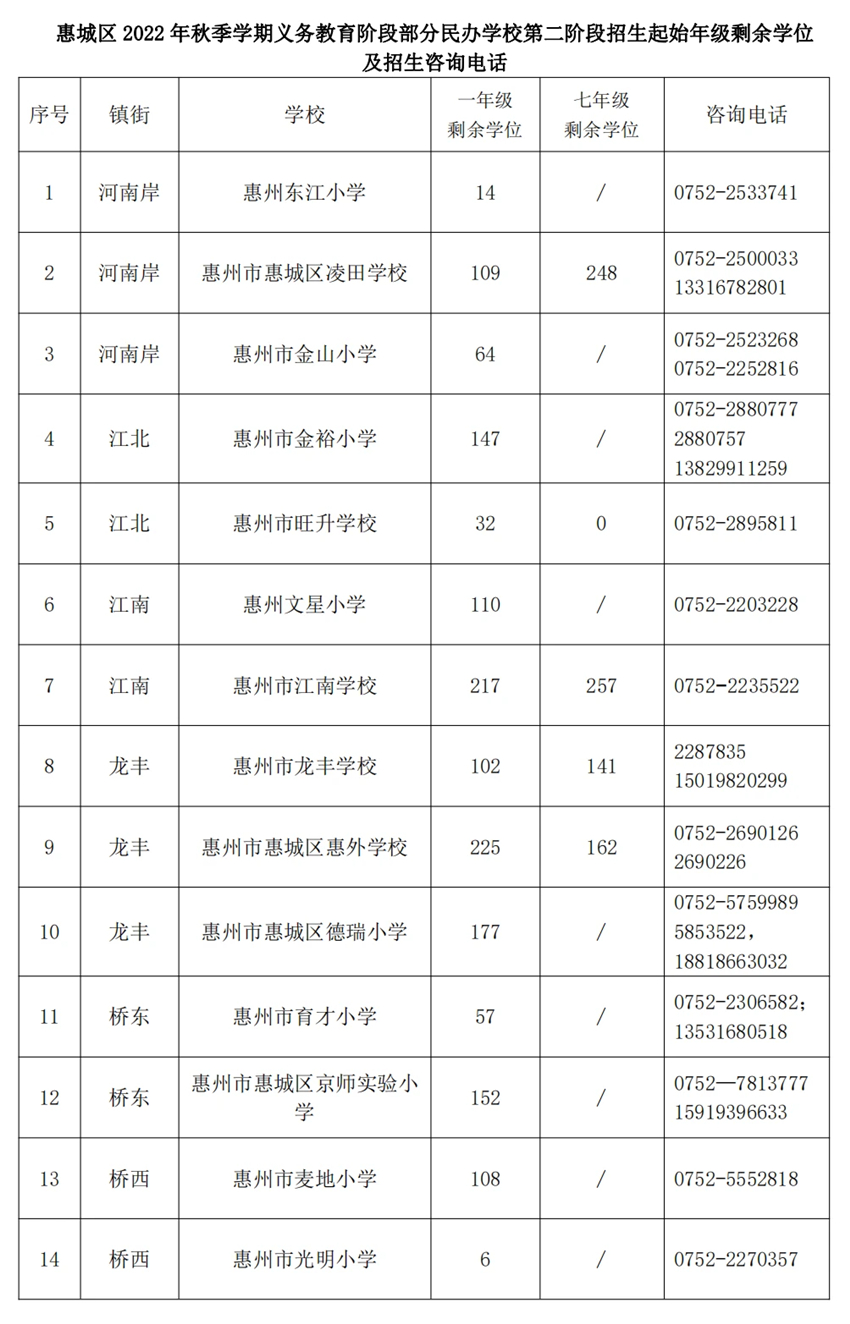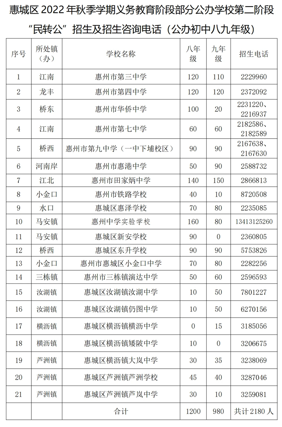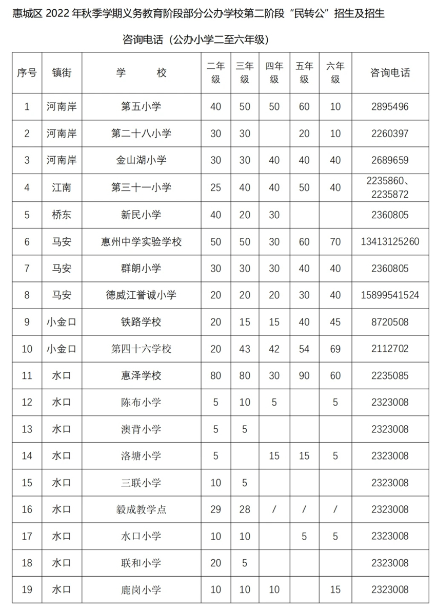 如部分公办起始年级第二批招生或非起始年级“民转公”招生学校报名人数不足开班的,则由区教育局按照相对就近原则统筹安排周边公办学校就读。为方便部分路途较远的家长,惠州市第四中学、惠州市田家炳中学、部分民办学校及农村中学均可提供部分住宿床位,详情可致电各学校咨询。