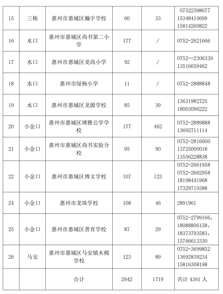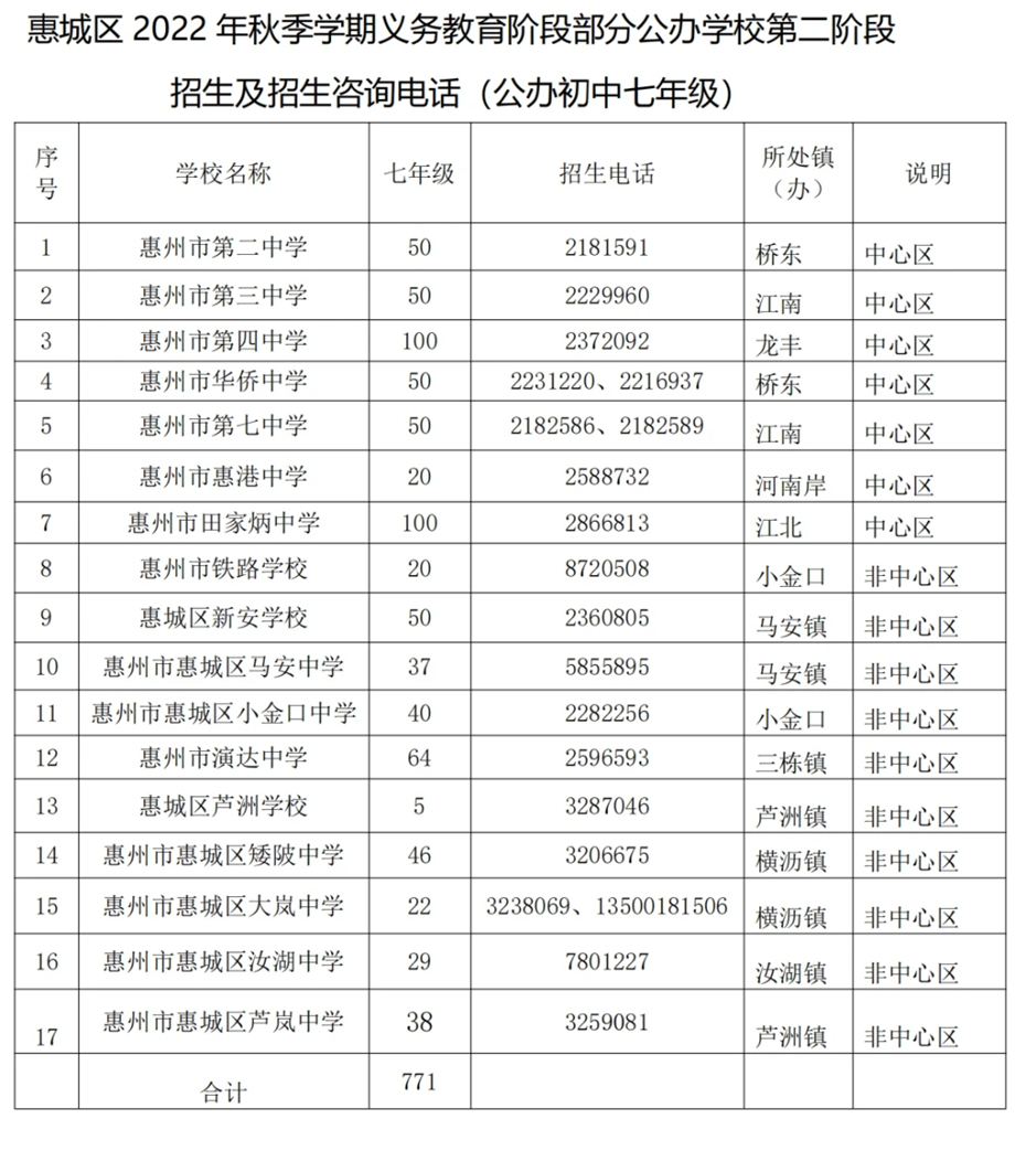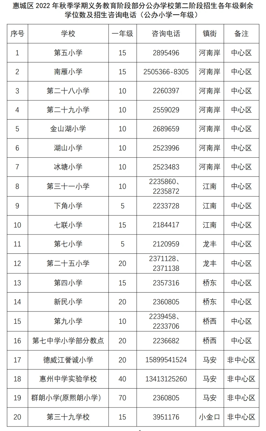如部分公办起始年级第二批招生或非起始年级“民转公”招生学校报名人数不足开班的,则由区教育局按照相对就近原则统筹安排周边公办学校就读。为方便部分路途较远的家长,惠州市第四中学、惠州市田家炳中学、部分民办学校及农村中学均可提供部分住宿床位,详情可致电各学校咨询。